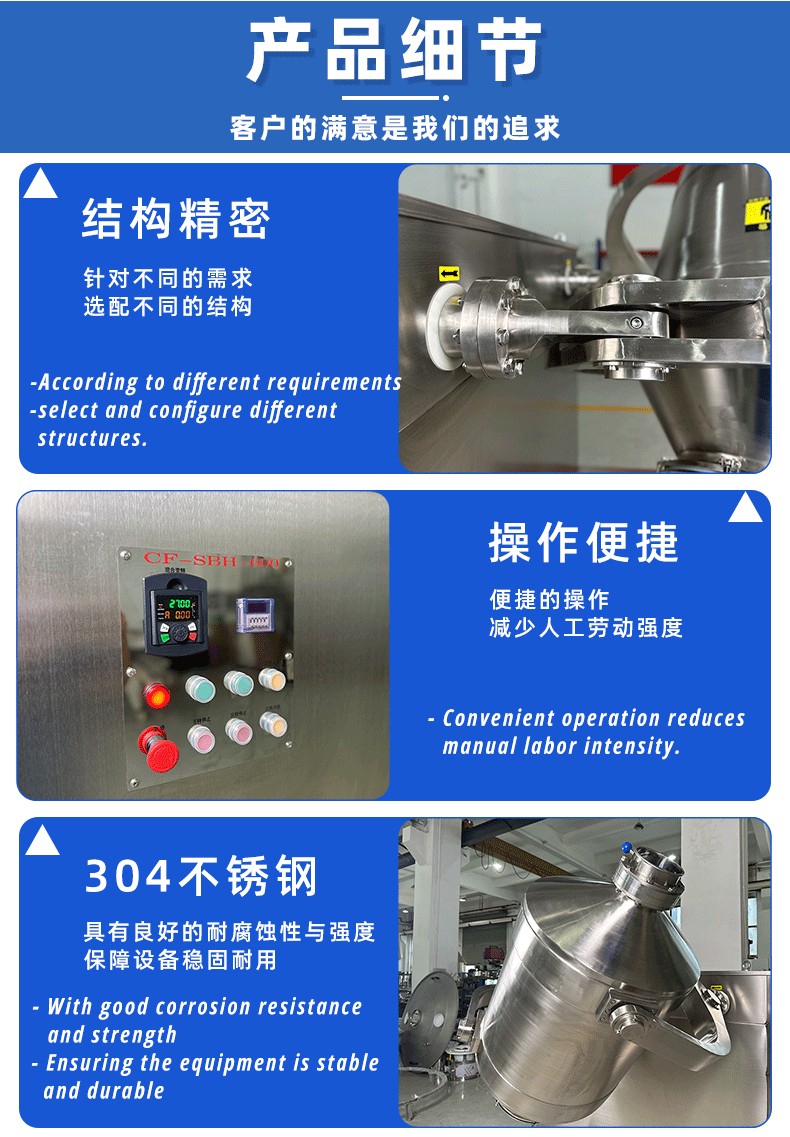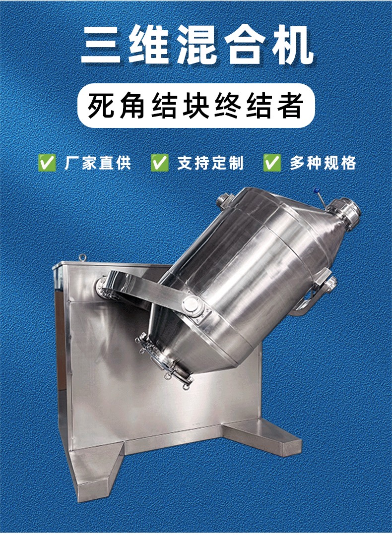 高效節能,混合效率提升顯著:三維復合運動使物料混合過程更高效,相較于傳統槽型混合機、V型混合機,混合時間縮短30%-50%,處理量提升40%以上;設備采用變頻調速電機,可根據物料特性精準調節轉速(5-30r/min),能量消耗較傳統設備降低25%以上。